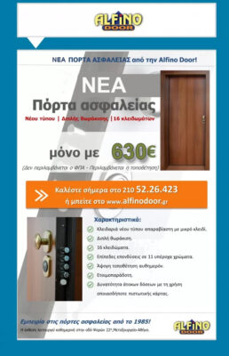 Για να βρείτε λύσεις που ταιριάζουν καλύτερα στις ανάγκες σας, επικοινωνήστε με την Alfino Door, ως έναν από τους μεγαλύτερους τοπικούς προμηθευτές πορτών ασφαλείας στο λεκανοπέδιο Αττικής. Μπορείτε να βασιστείτε σε εμάς για πόρτες ασφαλείας κορυφαίας ποιότητας, γρήγορη εγκατάσταση και άριστο after sale service. Καλέστε μας και ενημερωθείτε για όλες τις πόρτες ασφαλείας και κλειδαριές ασφαλείας νέας τεχνολογίας!